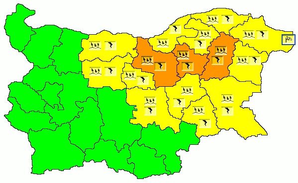 Кодът се отнася за областите Великотърновска, Търговищка и Шуменска. Там ще има краткотрайни, временно интензивни и значителни валежи от дъжд. Очаквани количества до 40-55 mm.