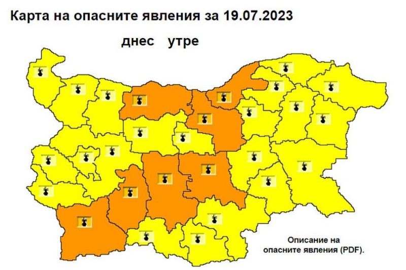 Националния институт по метеорология и хидрология (НИМХ) обяви жълт и оранжев код за опасно време в цялата страна. Оранжев код за очаквани горещини е обявен за Плевен, Велико Търново, Русе, Стара Загора, Пловдив, Пазарджик и Благоевград. Там се очаква температурите да достигнат до 40 градуса. В останалата част от страната е в сила жълт код и се очакват до между 35 и 38 градуса.