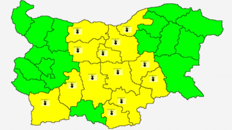 13 области в Централна Северна и Южна България са с жълт код за високи температури днес. В тези райони максималните температури ще са около 35°-38°. Нощните температури ще са над 20°. Преди обяд ще е предимно слънчево. След обяд ще се развива купеста и купесто-дъждовна облачност и на места, главно в планинските райони и Лудогорието ще има краткотрайни валежи и гръмотевици.