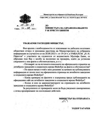 Бившият здравен министър Костадин Ангелов публикува в профила си във Facebook писмо на военния министър Тодор Тагарев, адресирано до здравния му колега Христо Хинков.