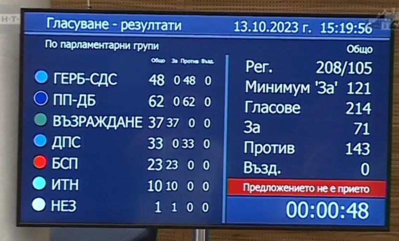 "Предложението не е прието, вотът не е успешен", заяви председателят на НС Росен Желязков. Гласуваха 214 народни представители, "ЗА" предложението гласуваха 71, а "против" 143. След това се проведе и прегласуване със същите резултати.