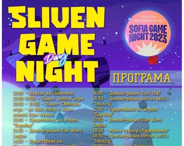 Виртуална ескейп стая, образователна климатична фреска, настолни игри за малки и големи, мини турнири с награди, панел посветен на детските игри и още много изненади очакват посетителите от всички възрасти в Сливен. Тази събота, 4 ноември, в зала „Сливен“ ще се състои поредната Нощ на игрите.