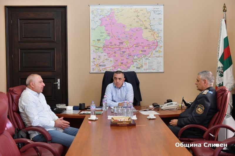 Теми, свързани с есенно-зимния отоплителен сезон и минимизирането на рисковете от пожари, обсъдиха на среща днес кметът Стефан Радев, комисар Денчо Чомаков - новият директор на Регионална дирекция „Пожарна безопасност и защита на населението” и неговият предшественик комисар Владимир Демирев. Те разговаряха още за съвместната дейност между институциите, приемствеността при предаване на управлението и въпроси, свързани с бъдещото преместване на пожарната в Сливен. Тримата са единодушни, че взаимодействието между двете институции до момента е на много високо ниво и увериха, че то ще продължи и занапред.