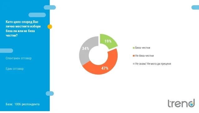 Оценката на отминалия местен вот показва високо недоверие към изборния процес. 47% от пълнолетните българи са на мнение, че вотът не е бил честен. Само 19% го определят като честен, като този дял е по-висок сред електората на ПП-ДБ и ГЕРБ.