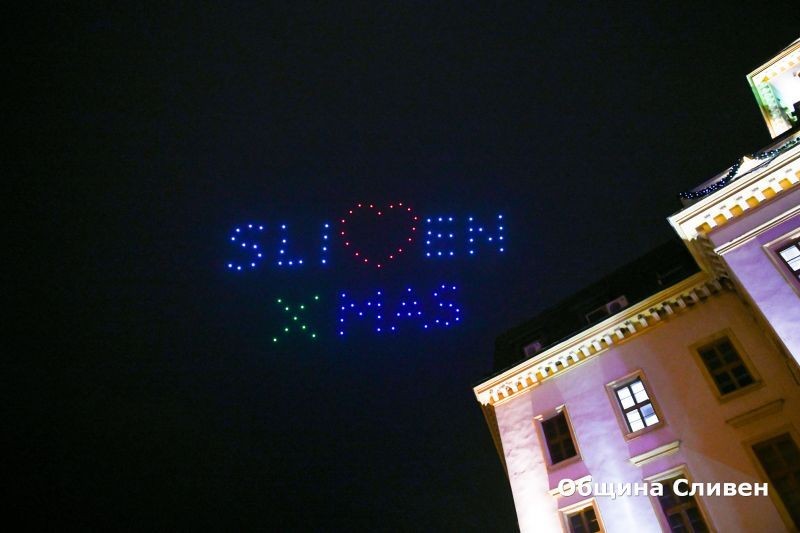 Церемонията започна с изненада. Десетки дронове прелетяха над площад "Хаджи Димитър", рисувайки във въздуха снежинки, елен, Дядо Коледа, снежен човек, ботуш, подарък, шейна. Накрая в небето се появи надпис Sliven Xmas!, като буквата V беше изписана под формата на сърце. Подобно дрон-шоу се случва за първи път в Града под Сините камъни и за него дълго ще се говори.