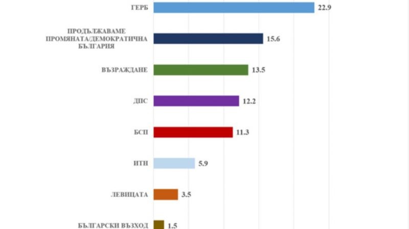За ГЕРБ в момента биха гласували 22.9% от избирателите, 15.6% - за ПП-ДБ, 13.5 на сто за "Възраждане", подкрепата за ДПС е 12.2%, 11,3% - за БСП, 5.9% пък е за ИТН. Под чертата, но с шанс за народни представители, е "Левицата", която засега обира симпатиите на 3,5 на сто от имащите право на глас.