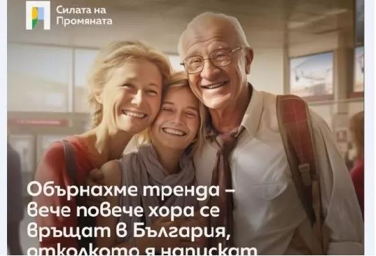 Текстът е придружен със снимка, създадена с помощта на изкуствен интелект и надпис: "Обърнахме тренда - все повече хора се връщат в България, отколкото я напускат."