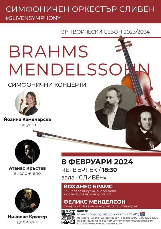 КОНЦЕРТ НА СИМФОНИЧЕН ОРКЕСТЪР-СЛИВЕН НА 8 ФЕВРУАРИ С ТВОРБИ НА БРАМС И МЕНДЕЛСОН