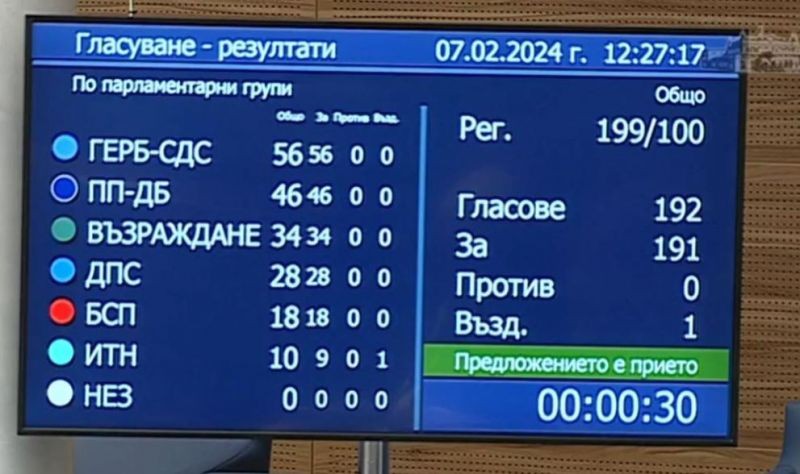 Народните представители приеха създаването на временна комисия за проверка на факти и обстоятелства, свързани с дейността на групата около Мартин Божанов. „За“ бяха 191 народни представители, без „против“, един „въздържал се“.