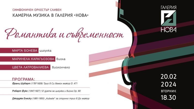 Цикъл от три бутикови концерта ще представят на сливенската публиката музикантите от Симфоничен Оркестър Сливен. Съвместният проект на културния институт и Национална Художествена Гимназия “Димитър Добрович”, е под надслов "Камерна музика в галерия "Нова".