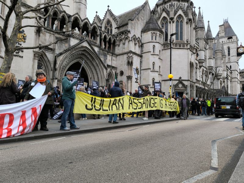 Миналата седмица в Лондон пред съда се събраха хиляди хора, които цял ден стояха навън, въпреки дъжда и призоваваха за освобождаването на Асанж. Много от тях бяха дошли от чужбина — Германия, Франция, Нидерландия, Италия, Швеция, САЩ, Австралия, Иран, Колумбия. Минаващи покрай сградата с коли надуваха клаксони в знак на солидарност. Това се случва при всяко заседание по делото, а всяка седмица в центъра на Лондон се събират обикновени граждани да протестират задържането на Асанж. Често има демонстрации и пред затвора, където той е задържан.