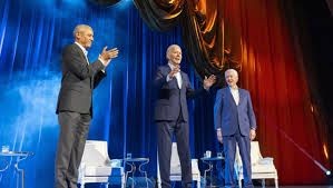 Байдън, който пристигна вчера следобед с президентския самолет "Ер Форс 1", на борда на който беше и Обама, и Клинтън се включиха в дискусия в прочутата нюйоркска театрална зала "Радио Сити Мюзик Хол", модерирана от водещия на "Късното шоу" (The Late Show, американско политико-сатирично токшоу - бел. ред.) Стивън Колбèр.