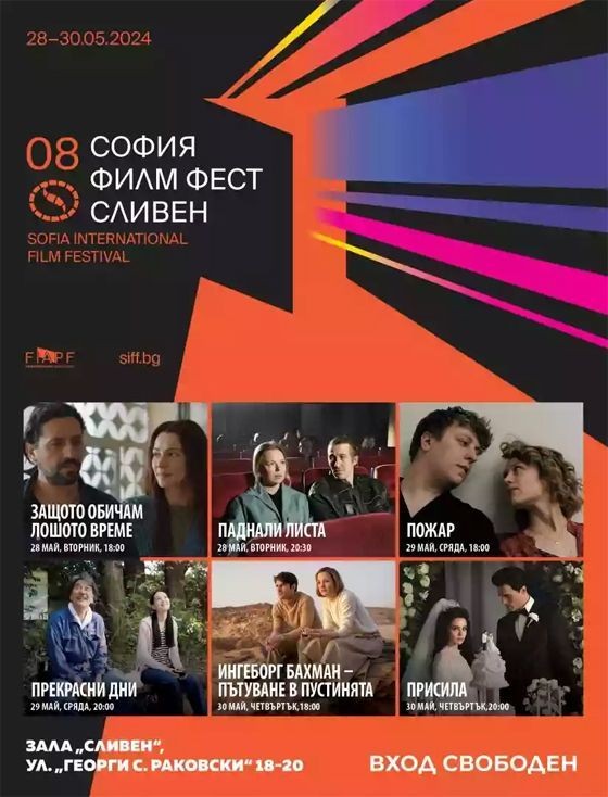 На 28 май ще бъде открит традиционният филмов фестивал „София филм фест в Сливен“. Тридневният кинофорум ще започне с българската лента „Защото обичам лошото време“ на режисьора Яна Лекарска, която ще представи филма пред сливенската публика. В ролите ще видите Неда Спасова, Владимир Михайлов, Боряна Пунчева, Елени Декидис, Веселин Ранков, Иван Бърнев. Прожекцията започва в 18 часа в зала „Сливен“.