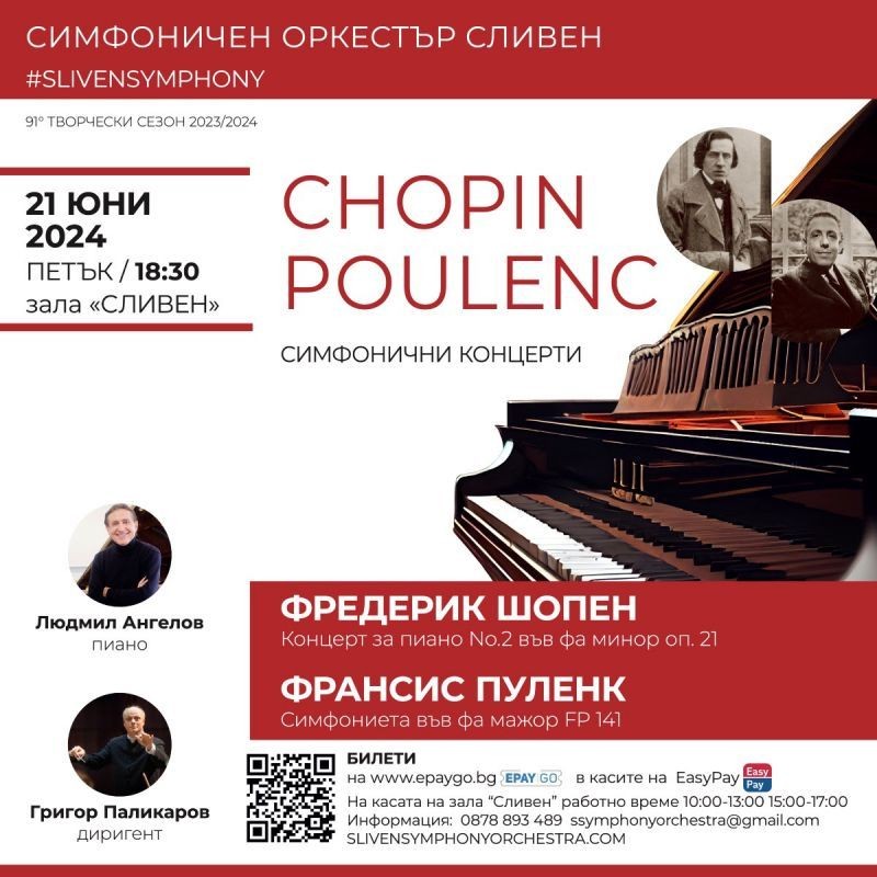 Великият виртуоз Фредерик Шопен е автор на два клавирни концерта. Любопитен факт е, че този във Фа минор, известен като No.2, всъщност е написан по-рано от ми минорния (No.1). Създадени, когато Шопен е около 20-годишен, клавирните концерти представят романтичния прочит на младия композитор на класическите драматургични принципи на тричастния концертен жанр. Великолепната и чувствена творба публиката ще има възможност да чуе в изпълнение на световно признатия пианист Людмил Ангелов.