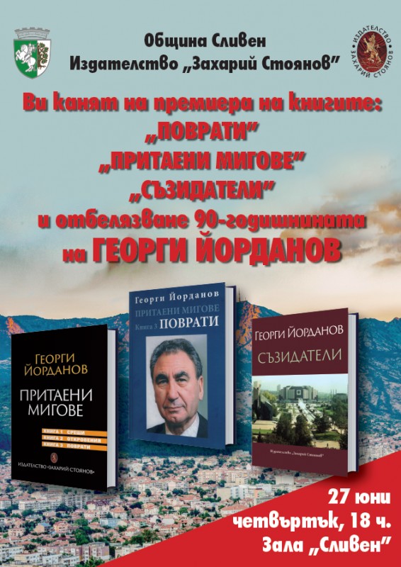 На 27 юни ще се състои премиера на книгите на Георги Йорданов „Поврати“, „Притаени мигове“ и „Съзидатели“. Събитието, което ще започне в 18 часа в зала „Сливен“, ще отбележи и 90-годишния юбилей на родения в Твърдица министър на културата от 1986 до 1989 година.