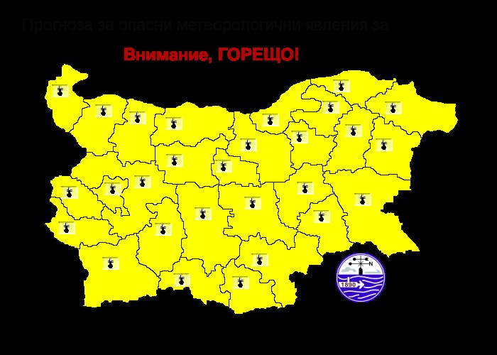 Предупредителен жълт код за горещо време издаде за днес Националният институт по метеорология и хидрология. Предупреждението важи за територията на цялата страна.