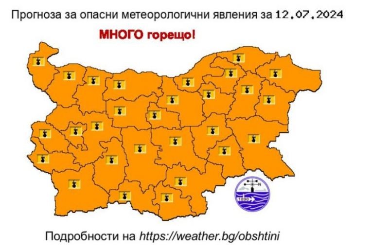Оранжев код е обявен за опасни горещини от Националния институт по метеорология и хидрология за днес. Предупреждението е в сила за цялата страна.