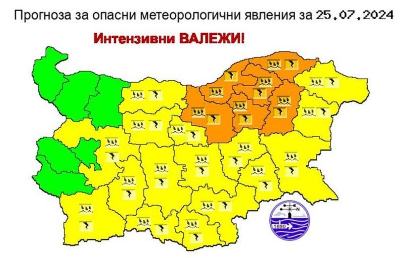 Жълт и оранжев код за интензивни валежи за днес, 25 юли, обявиха от Националния институт по метеорология и хидрология (НИМХ).