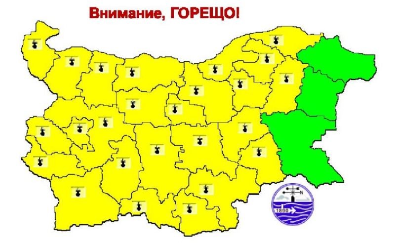 ЖЪЛТ КОД ЗА ОПАСНО ВИСОКИ ТЕМПЕРАТУРИ В ПОЧТИ ЦЯЛАТА СТРАНА