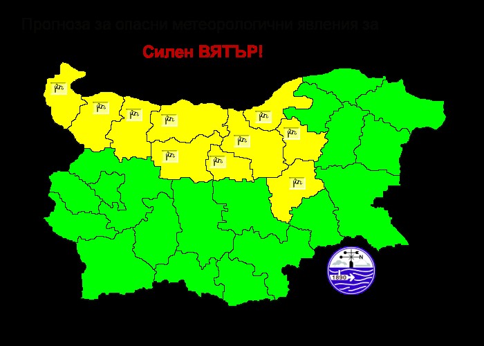 Жълт предупредителен код за силен вятър издаде за днес Националният институт по метеорология и хидрология за 10 области предимно в Северна България.