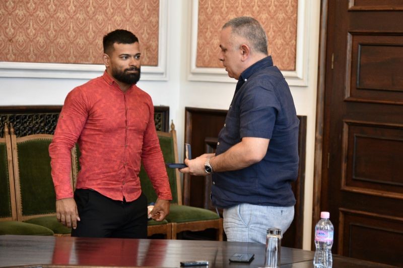 КМЕТЪТ СТЕФАН РАДЕВ ПОСРЕЩНА ОЛИМПИЙСКИЯ МЕДАЛИСТ БОЖИДАР АНДРЕЕВ И ТРЕНЬОРА МУ ПЛАМЕН БРАТОЙЧЕВ