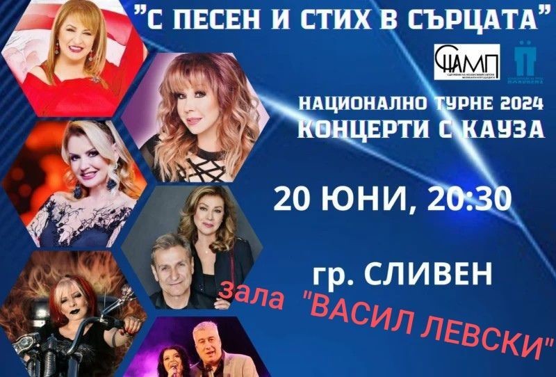 Сливен е част от националното турне “Концерти с кауза” - “С песен и стих в сърцата”, което се провежда в подкрепа на хората с репродуктивни проблеми и “за” повече българска музика в национален ефир. Публиката ще се наслади на незабравимите хитове на популярни български изпълнители, прегърнали каузите и убедени в мисията да бъдат техни посланици - Маргарита Хранова, Нели Рангелова, Петя Буюклиева, Милена Славова, Росица Ганева, Дует “Шик”, Дует “WEIL”, Искрен Пецов, Коцето Калки, Дует с кауза /Галя Георгиева и Наско Лазаров/, Вокално трио Déjà Vu /Мирослав Станчев, Дражо Бошнаков и Бранимир Недков/, група “Спринт”, група “Хоризонт”, Красимир Недялков, група ЖестиМ - group GestiM