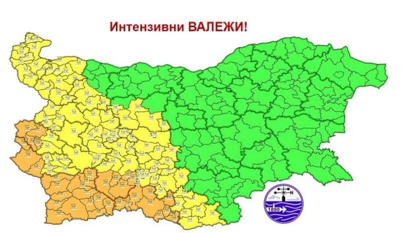 ПРЕДУПРЕЖДЕНИЕ ЗА ОПАСНО ВРЕМЕ - ЖЪЛТ И ОРАНЖЕВ КОД ЗА ОБИЛНИ ВАЛЕЖИ И ГРЪМОТЕВИЦИ