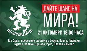 На 21 октомври от 18 ч. "Възраждане" организира национална акция "Дайте шанс на мира". Ще бъдат проведени шествия в София, Варна, Пловдив, Бургас, Велико Търново, Русе, Плевен и Ямбол. Разбира се, това е към този момент. Всеки, който желае, нека се чувства поканен да организира заедно с нас подобни шествия в своя град или село. Мирът и войната нямат партийна окраска, те важат за всички еднакво. В този момент обаче единствената политическа сила в България, която защитава мира, е "Възраждане".