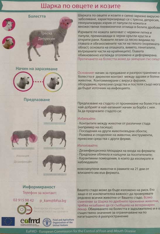 Към момента няма данни за разпространение на шарка и чума по овцете и козите на територията на община Сливен. Това стана ясно на заседание на общинската епизоотична комисия. На него официалният ветеринарен лекар за oбщината д-р Веселин Василев информира, че в страната вече има констатирани случаи на заболяването. В тази връзка комисията взе решение да се предприемат превантивни мерки по ограничаване разпространението на болестта, с които кметовете и кметските наместници във всяко едно населено място от общината да информират и запознаят населението за проявлението и последиците от болестта. При съмнения или смъртни случаи стопаните задължително и незабавно да известят официалния ветеринарен лекар.