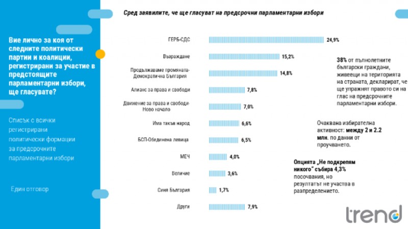 От данните става ясно, че ГЕРБ-СДС е лидер в класацията с подкрепата на 24.9 на сто от гласуващите. В битката за второто място са Възраждане - с 15.2 процента и "Продължаваме промяната-Демократична България" - с 14.8 на сто подкрепа. Следват "Алианс за права и свободи" със 7.8 процента, "ДПС-Ново начало" - със 7 на сто, "Има такъв народ" - със 6.6 процента и БСП - със 6.5 на сто. В борба за парламентарно представителство са и МЕЧ - с 4 процента, "Величие" - с 3,6 процента и "Синя България" - с подкрепата на 1,7 на сто от гласуващите.