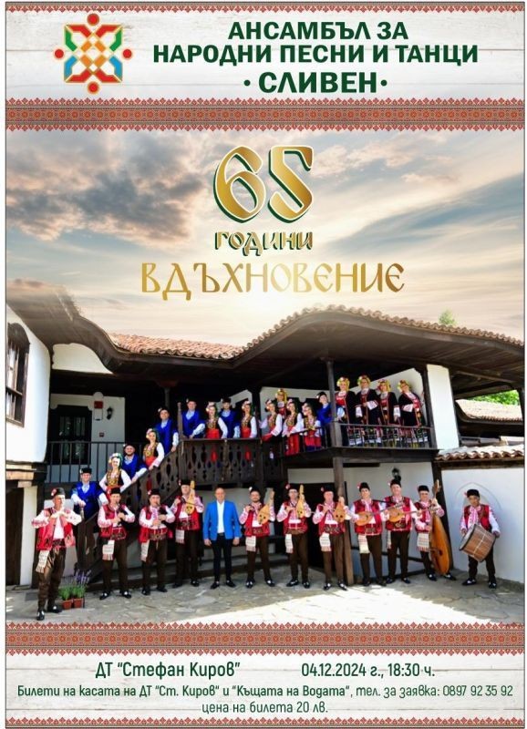 С голям концерт сливенският Ансамбъл за народни песни и танци ще отбележи 65-годишния си юбилей. Концерт-спектакълът ще се състои в залата на Драматичен театър „Стефан Киров“ на 4 декември. Певците и танцьорите на формацията ще поднесат на зрителите невероятни емоции и преживявания, съпътстващи историята на ансамбъла през годините. Началото ще бъде от 18.30 ч.