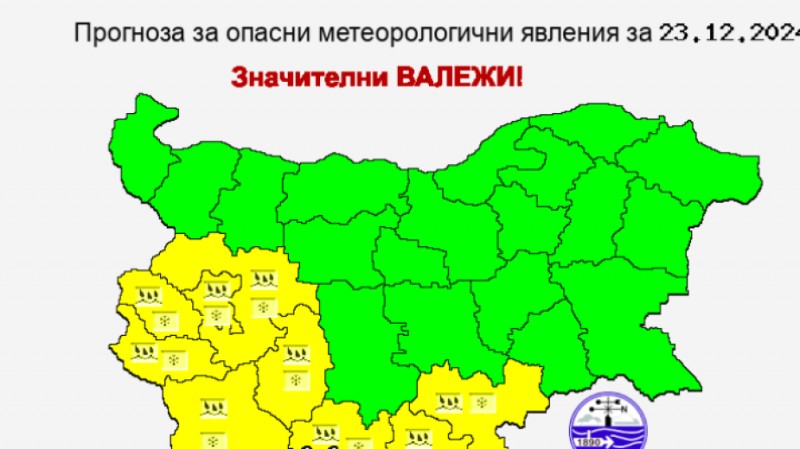 Жълт код за значителни количества валежи е в сила за София град и област, Перник, Кюстендил, Благоевград, Пазарджик, Смолян, Кърджали и Хасково.