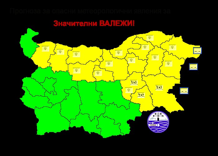 Жълт код за валежи от сняг и дъжд издаде за днес Националният институт по метеорология и хидрология за 16 области предимно в Източна и Северна България (виж графиката по-долу).
