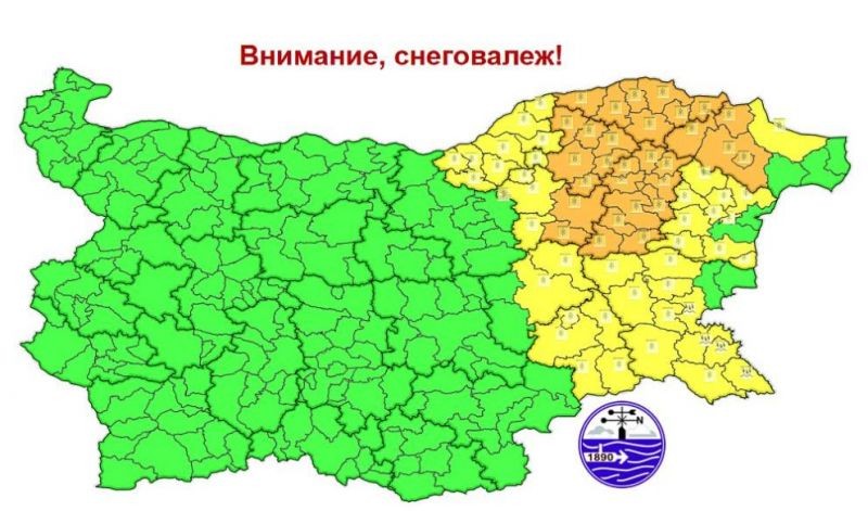 Във вторник (18 февруари) Националният институт по метеорология и хидрология (НИМХ) издава предупреждение от втора и първа степен - оранжев и жълт код, за снеговалежи в Източна България. Това се съобщава в картата с предупредителните кодове за опасните метеорологични явления, публикувана в сайта на НИМХ.