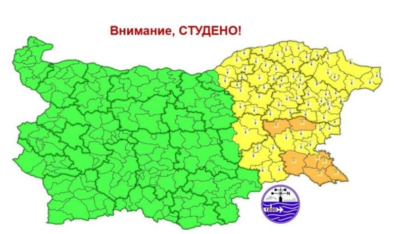 Жълт код за опасно и студено време е обявен в областите Русе, Силистра, Добрич, Варна, Шумен, Разград, Търговище, Сливен, Ямбол и Бургас. Като части от региона Бургас са оцветени и в оранжево.
