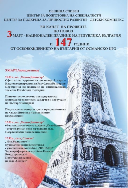 Община Сливен организира редица събития по повод 3 март – Националния празник на Република България и 147 години от Освобождението на страната от османско иго.