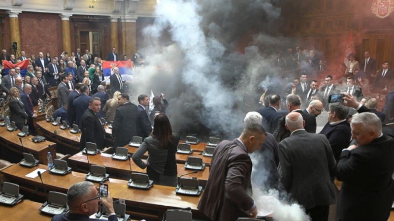 ХАОС В СРЪБСКИЯ ПАРЛАМЕНТ - ЗАЛАТА БЕШЕ ОБГАЗЕНА, ЛЕТЯХА БУТИЛКИ, РАНЕНИ СА 3 ДЕПУТАТКИ