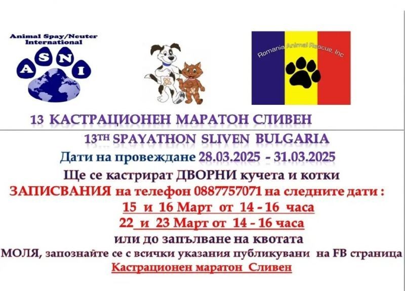 Провеждането на 13-и безплатен кастрационен маратон се планира в Сливен. Процедурите ще се състоят в дните от 28 март до 31 март и ще обхванат дворни кучета и котки. В него ще се включат медицински специалисти от Romania Animal Rescue и Inc Dba Animal Spay Neuter International.