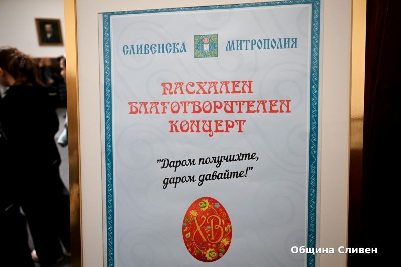 Благотворителен пасхален концерт „Даром получихте, даром давайте!“ беше организиран от Сливенска света митрополия и Негово високопреосвещенство Сливенски митрополит Арсений. Каузата е в подкрепа на талантливи деца от Сливен. Събитието се състоя на Светли петък в зала „Зора“. Сред гостите бяха кметът Стефан Радев, председателят на Общинския съвет Димитър Митев, заместник-кметът Пепа Чиликова, ученици, родители и приятели.