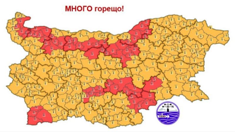 Времето в събота ще бъде още по-горещо, като Националният институт по метеорология и хидрология издаде червен код (трета степен) за опасно горещо време в 12 области на страната - Видин, Монтана, Враца, Плевен, Ловеч, Велико Търново, Русе, Ямбол, Хасково, Стара Загора, Пловдив, Благоевград. Там дневните температури ще прехвърлят 41 градуса по Целзий.