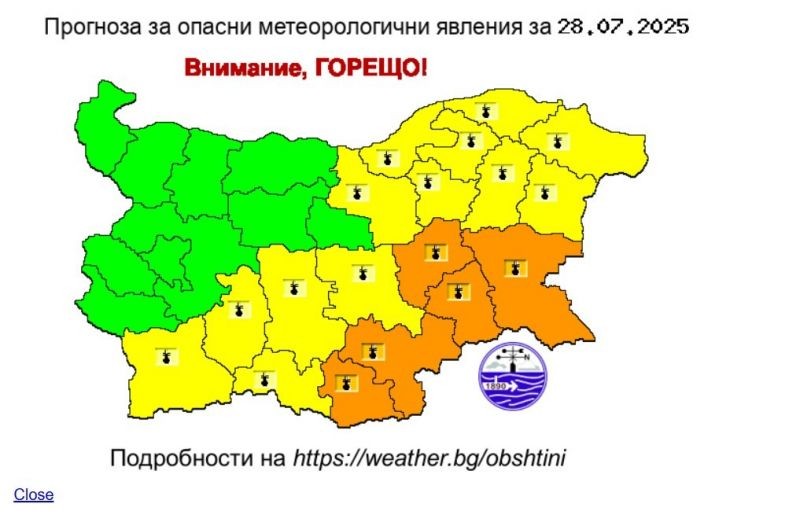 ЖЪЛТ И ОРАНЖЕВ КОД ЗА ГОРЕЩО ВРЕМЕ В 18 ОБЛАСТИ, ТЕМПЕРАТУРИ ДО 39°