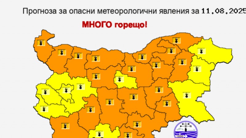 Жълт и оранжев код за високи температури е издаден за цяла България. Малко по-ниски ще бъдат температурите край морето и в София-град и област, както и в Смолянска, Кюстендилска и Пернишка област, където кодът е жълт. В останалите части на България кодът е оранжев.