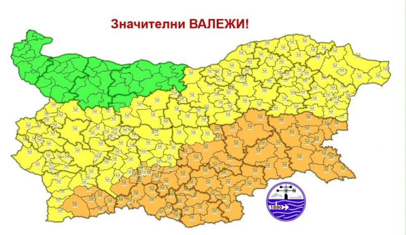 За цяла Южна България е в сила предупреждение от втора степен - оранжев код, за опасно време. В Западна, Централна Северна и Североизточна България в сила е предупреждение от първа степен - жълт код.