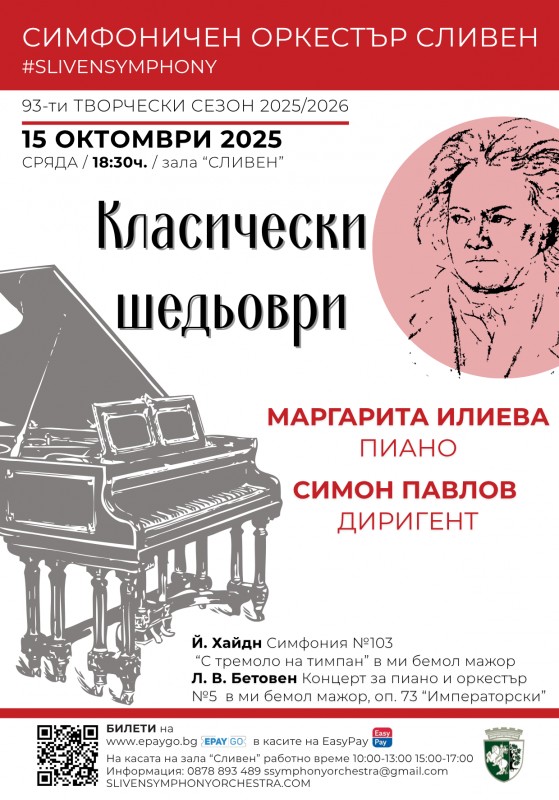 В празничната програма, под палката на сливенския диригент Симон Павлов, ще прозвучат монументалния „Императорски“ концерт №5 от Лудвиг ван Бетовен, в изпълнение на пианистката Маргарита Илиева и Симфония № 103 „С тремоло на тимпан“ от Йозеф Хайдн.