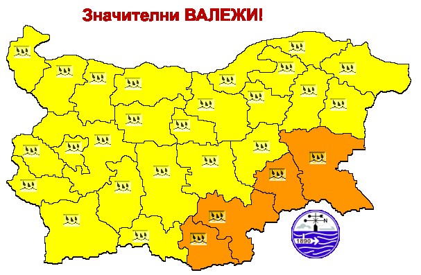 Жълт и оранжев предупредителен код за значителни валежи издаде за днес Националният институт по метеорология и хидрология. Оранжев е кодът за областите Кърджали, Хасково, Ямбол и Бургас, а за останалите - жълт.