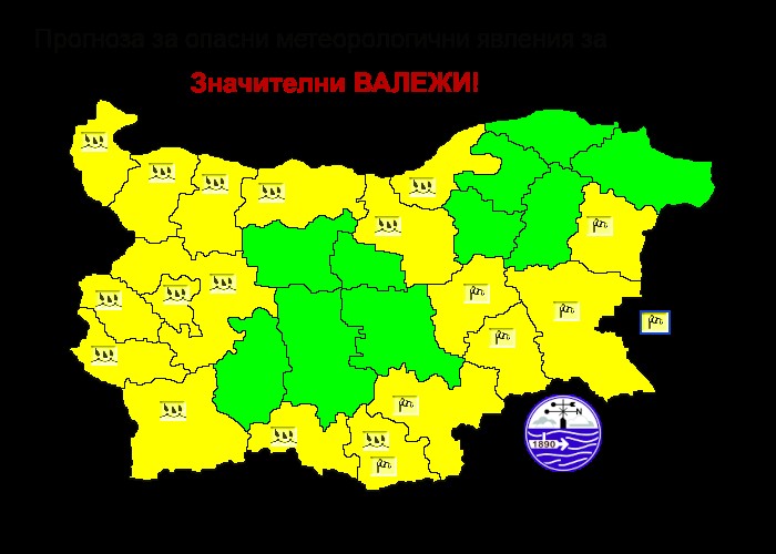 ЖЪЛТ КОД ЗА ЗНАЧИТЕЛНИ ВАЛЕЖИ В 11 ОБЛАСТИ И ЗА СИЛЕН ВЯТЪР В ШЕСТ ОБЛАСТИ