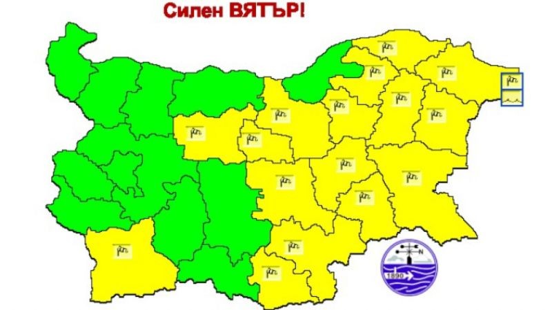 Синоптиците обявяват жълт код за потенциално опасно време и силен вятър в половин България. Предупреждението е в сила за областите: Добрич, Силистра, Разград, Шумен, Търговище, Велико Търново, Габрово, Ловеч, Варна, Бургас, Ямбол, Сливен, Стара Загора, Хасково, Кърджали и Благоевград.