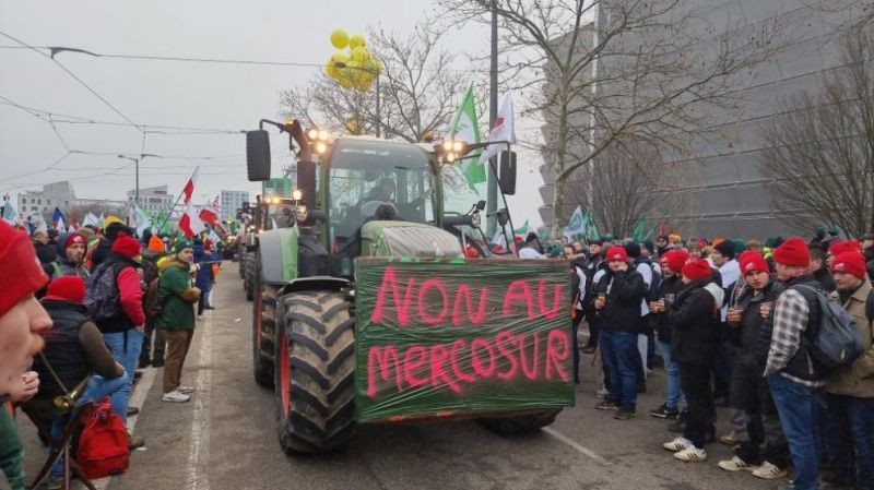 Около 40 българи са на протеста пред Европейския парламент в Страсбур, каза Илия Проданов - председател на Управителния съвет на Националната асоциация на зърнопроизводителите (НАЗ). Споразумението беше подписано на 17 януари в Парагвай.