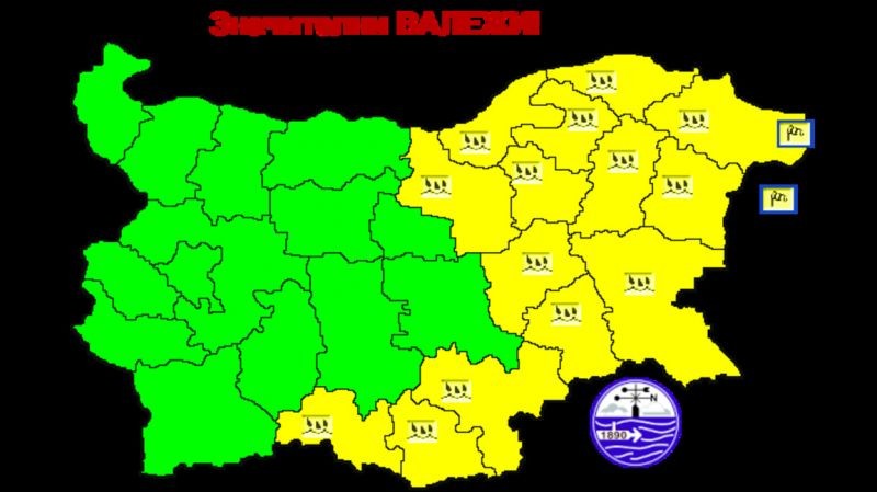 Жълт код за значителни количества валежи е обявен за областите Смолян, Кърджали, Хасково, Ямбол, Бургас, Сливен, Варна, Шумен, Разград, Търговище, Русе и Силистра.
